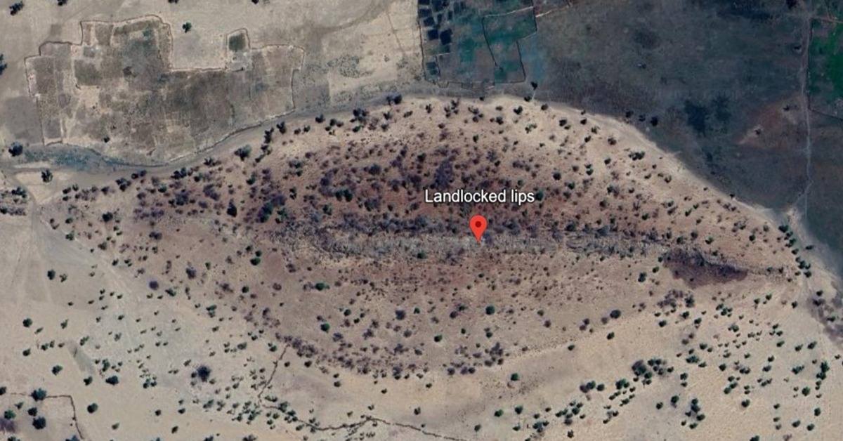 蘇丹一處神秘山丘因外型酷似人類嘴唇,被稱為「內陸之唇」(Landlocked Lips)。(圖/翻攝自Google Earth)