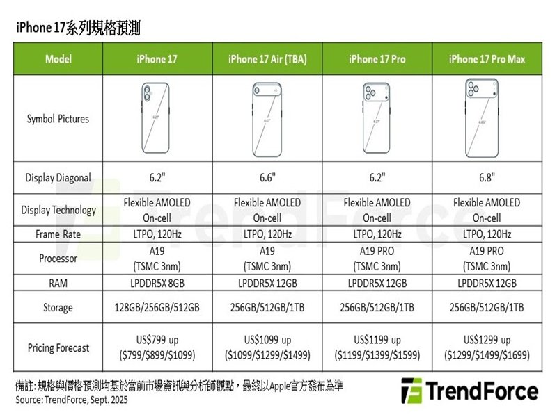 定價上,iPhone 17基本款預期將維持去年價格、Air、Pro及Pro Max因創新突破與規格升級,預估比去年同容量機型上調50-100美元,其中Air將對標對手Samsung S25 Edge的市場價格。這也展現Apple藉由產品差異化持續強化品牌吸引力。