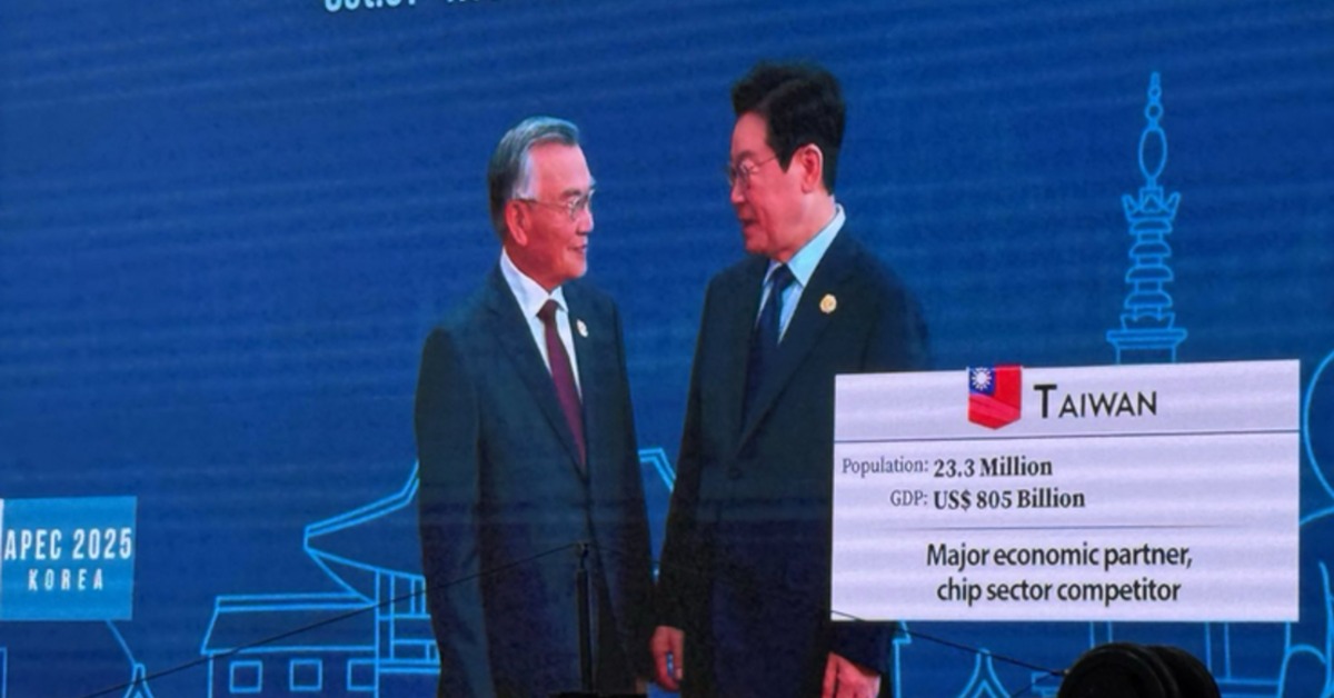 APEC經濟領袖峰會登場,亮點不斷,經濟領袖依序進場,和韓國總統李在明依序握手,在台灣領袖代表林信義入場時,大會在媒體中心轉播畫面上,圖卡上秀出青天白日國旗,台灣還被韓方描述為夥伴與晶片競爭對手。場內圓桌,台灣代表則和中國國家主席習近平面對面。