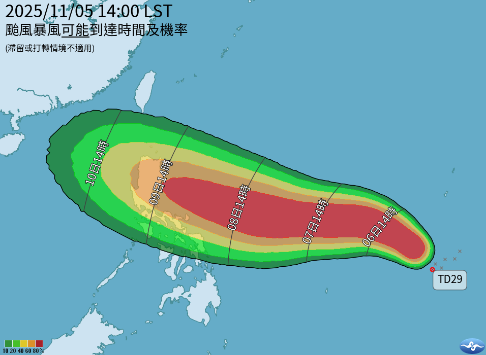 中央氣象署表示,熱帶性低氣壓TD29號,中心氣壓1002百帕,5日14時的中心位置在北緯8度,東經142.7度,即在雅浦島東南東方530公里之處(鵝鑾鼻東南東方2800公里之處),以每小時18公里速度,向西北進行,預測6日14時的中心位置在北緯10.9度,東經140.5度,即在雅浦島東北東方310公里之處(鵝鑾鼻東南東方2420公里之處),有發展為輕度颱風的趨勢。