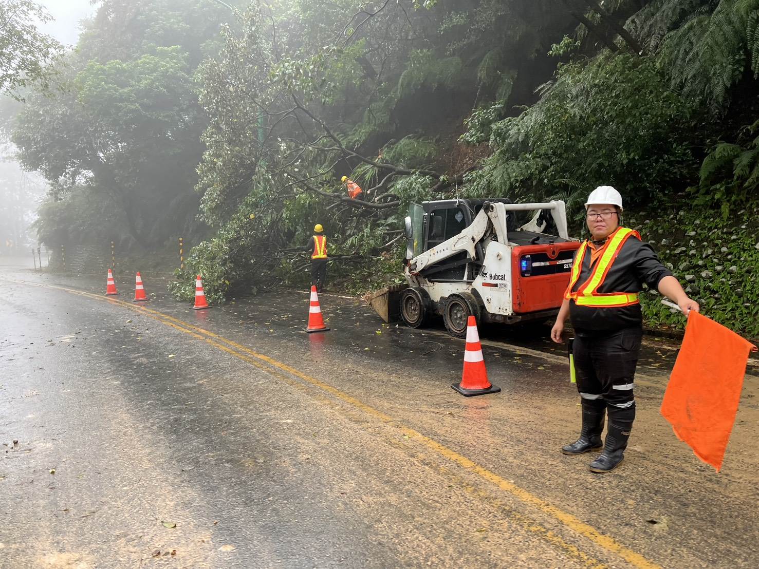 台2甲線8.8K處上邊坡處,發生局部邊坡坍滑及樹木倒塌,經調派人力、機具進場辦理搶修,已於上午10時初步排除狀況。