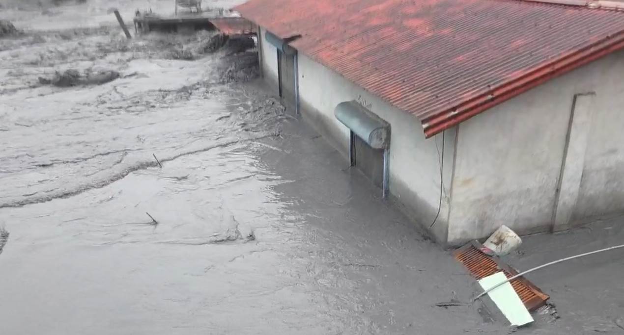 花蓮45線2K處,自昨晚大排溢流後持續湧入土石泥沙,目前堆積將近1公尺且泥水還不斷湧進。另明利村上游有撤離家禽養殖戶,趁風雨暫緩機會返回住處,發現飼養山豬跟家禽的區域都被洪水淹沒。