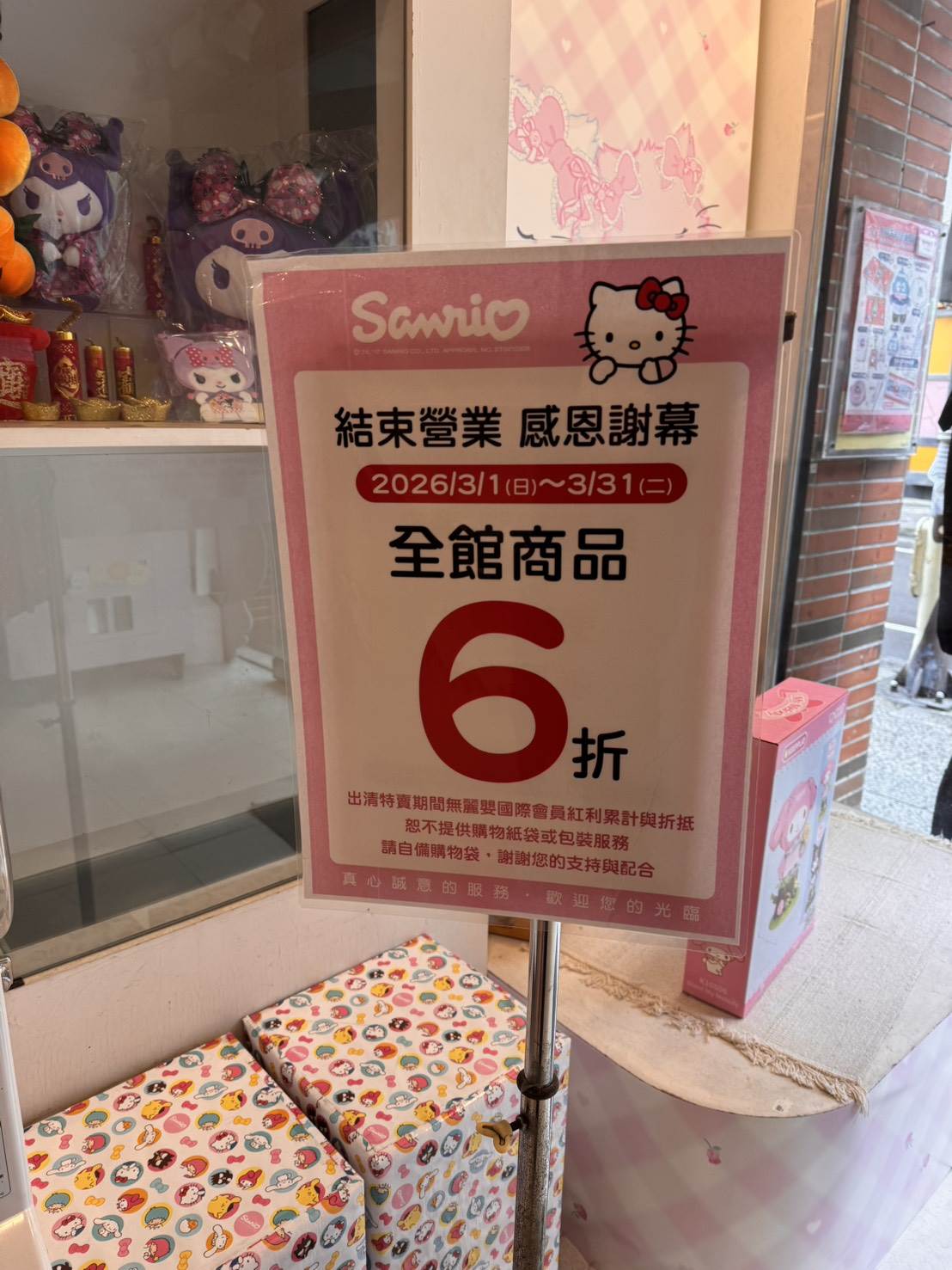 有消費者向《EBC東森新聞》表示,淡水區中正路159號的三麗鷗直營店近日貼出「結束營業感恩謝幕」公告,公告中可見,自即日起至3月31日寄出全館商品6折優惠,不過出清特賣期間無麗嬰國際會員紅利累積與折抵,恕不提供購物紙袋或包裝服務,提醒消費者可以自備購物袋。